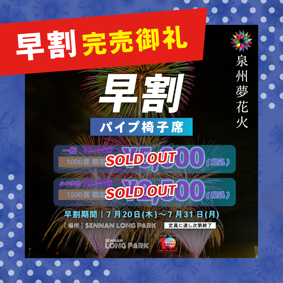 ※駐車場チケットの販売はございません。SENNAN LONG PARK常設の駐車場はご利用いただけますが、台数に限りがございます。また、当日駐車利用料金は通常時と異なります。